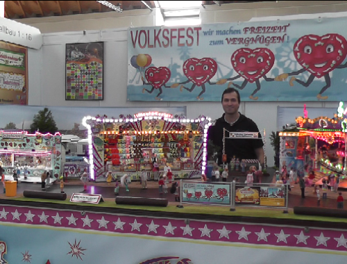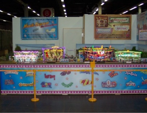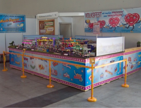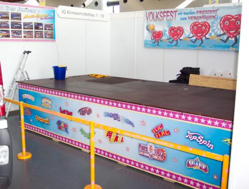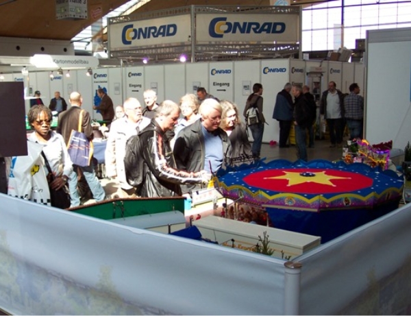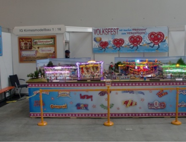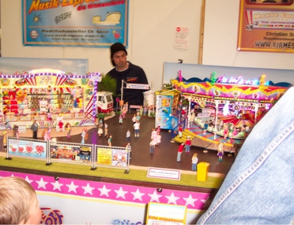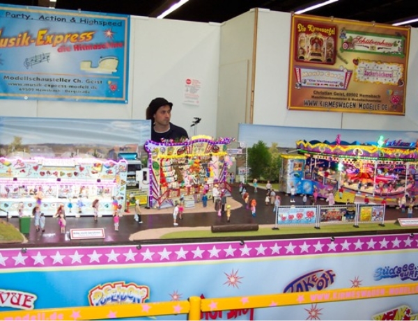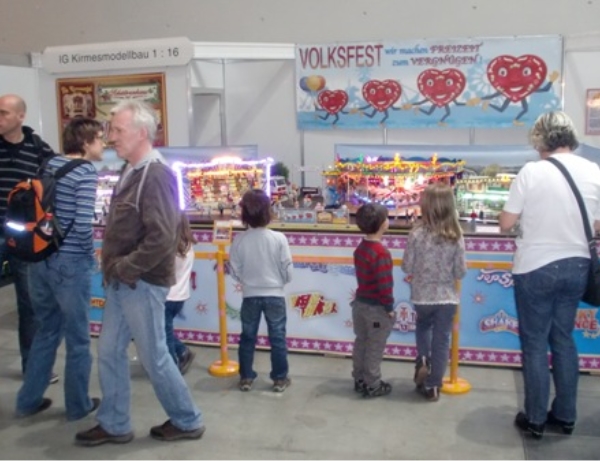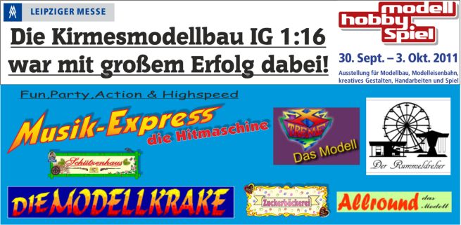 in Halle 8, Stand 8.E08Kirmesmodellbau IG 1:16Unser Messestand in Halle 3, Stand Nr.: 3018Großer Modellrummelplatz mit dem Musik-Express,dem Schützenhaus und der Zuckerbäckereiauf der 17. Faszination Modellbau in KarlsruheVom 24. bis 27. März 2011 hat die Faszination Modellbau Karlsruhe den Saisonauftakt 2011 eingeläutet und sich als die Mitmach-Messe schlechthin positioniert.Zu Wasser, zu Lande und in der Luft ließen 372 Aussteller, Marktführer, Kleinserienhersteller aus 10 Ländern (Belgien, Deutschland, Frankreich, Großbritannien, Italien, Luxemburg, Niederlande, Österreich, Schweiz, Ungarn) die Besucherherzen höher schlagen und zeigten auf ihren Messeständen Produkte in den Bereichen Modellbahnen und Zubehör, Flugmodellbau, RC Car und Automodellbau, Truckmodellbau, Militärmodellbau, Schiffs-modellbau, Plastikmodellbau und Kartonmodellbau. Mit 52.000 Besuchern konnte die Faszination Modellbau 2011 annähernd an die letztjährigen Besucherzahlen anknüpfen.Quelle: Messe Sinsheim