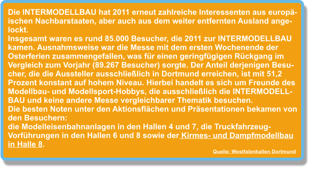 Begeisterte Spieler, rasante Autorennen, detailgetreue Modellbahnwelten und bunte Ideen. Vier Tage lang strömten insgesamt 102.000 Besucher zur 16. modell-hobby-spiel. Dabei präsentierten und informierten 641 Aussteller aus den Bereichen Modellbau, Modellbahn, kreatives Gestalten, Spiel und Philatelie den Besucher aktuellen Trends und neuen Produkten.(Quelle: Leipziger Messe)